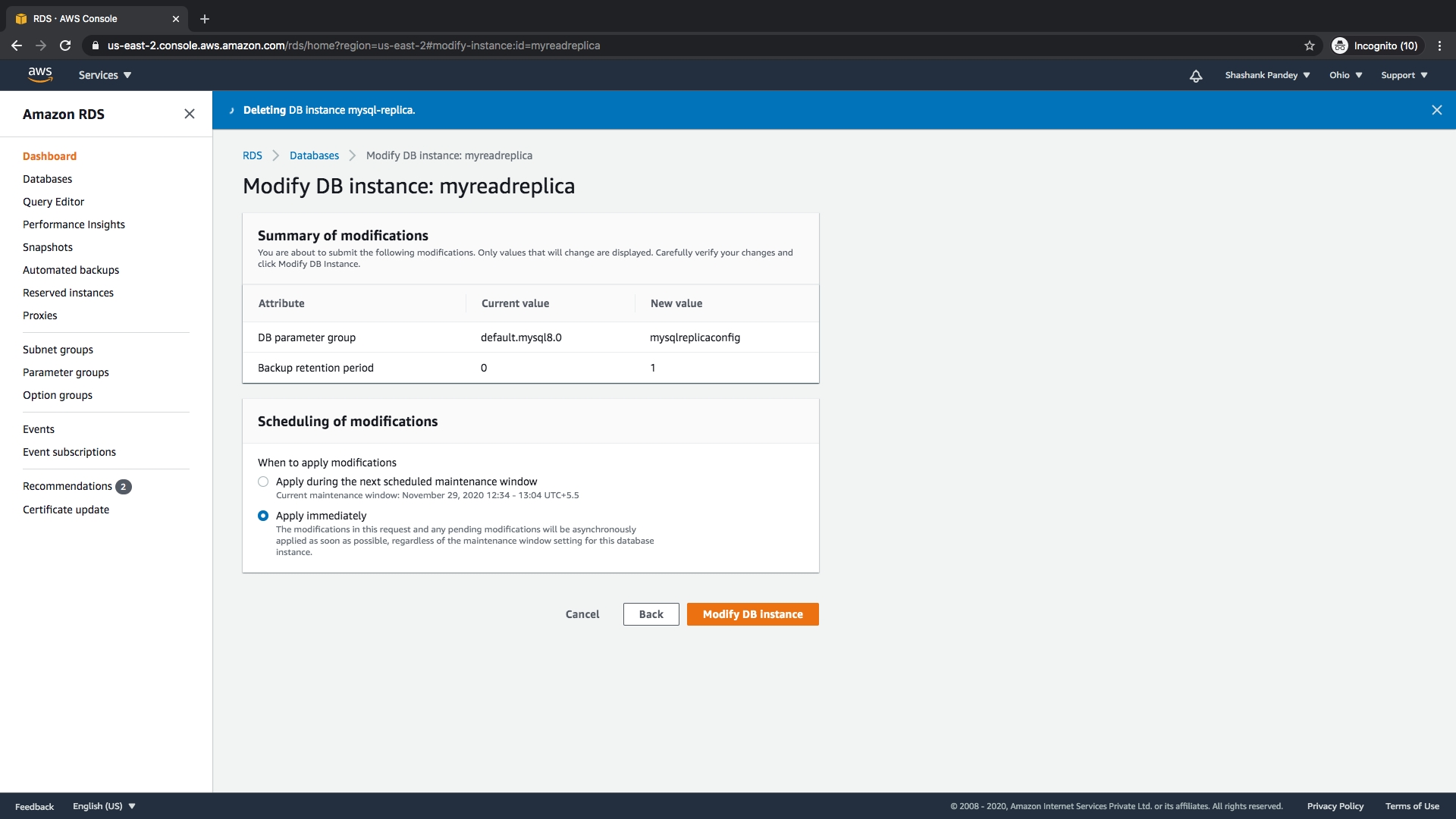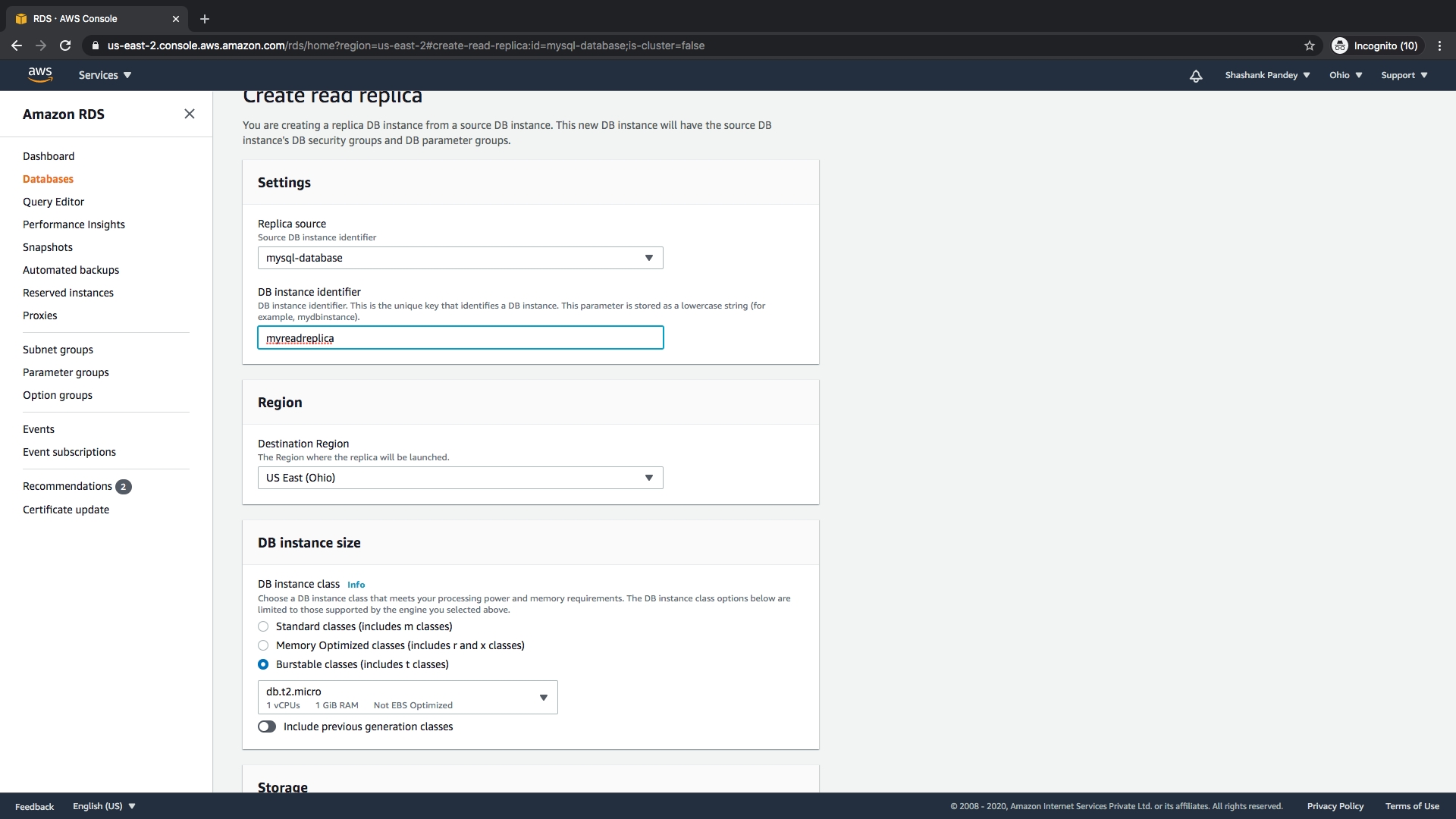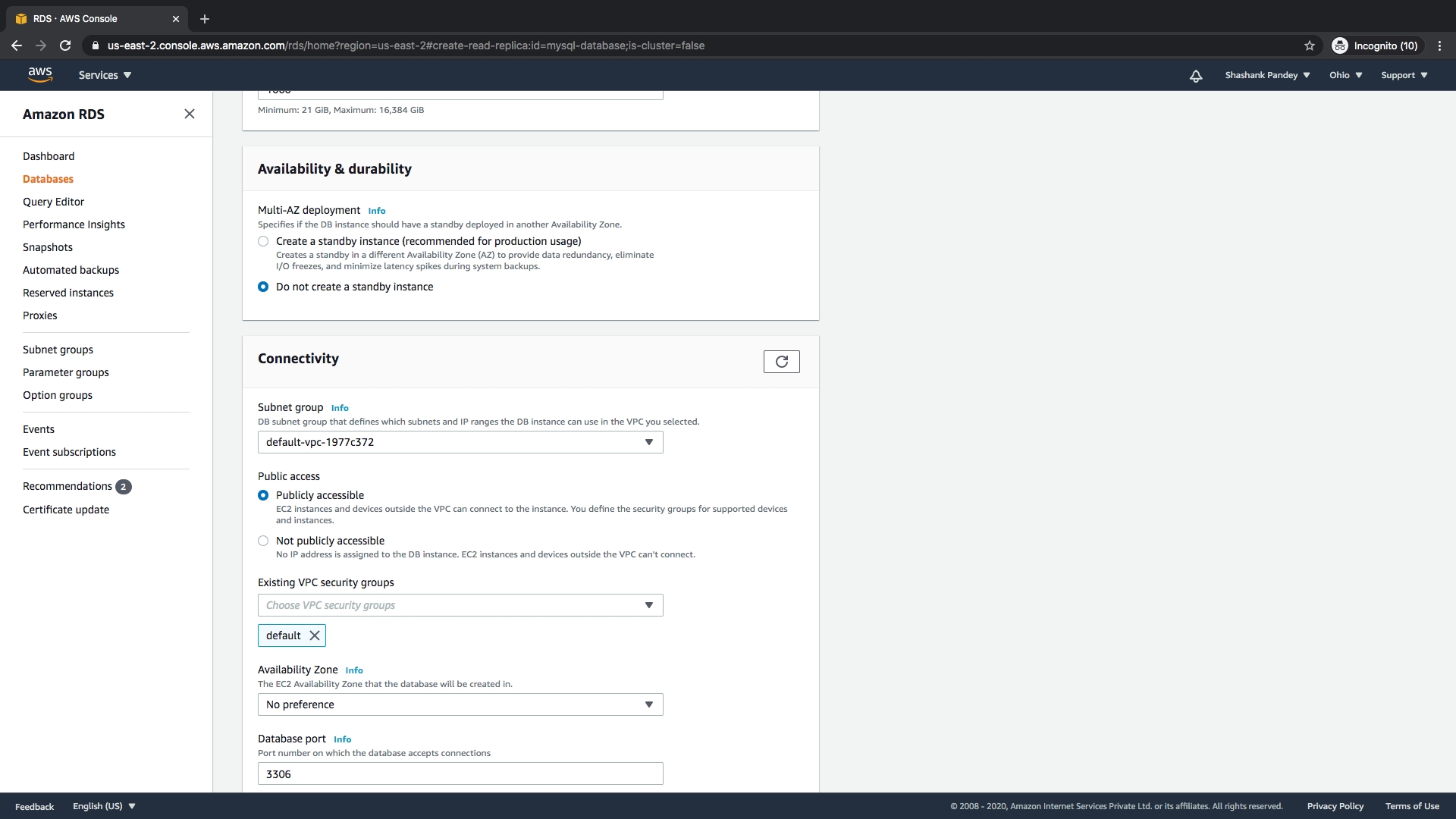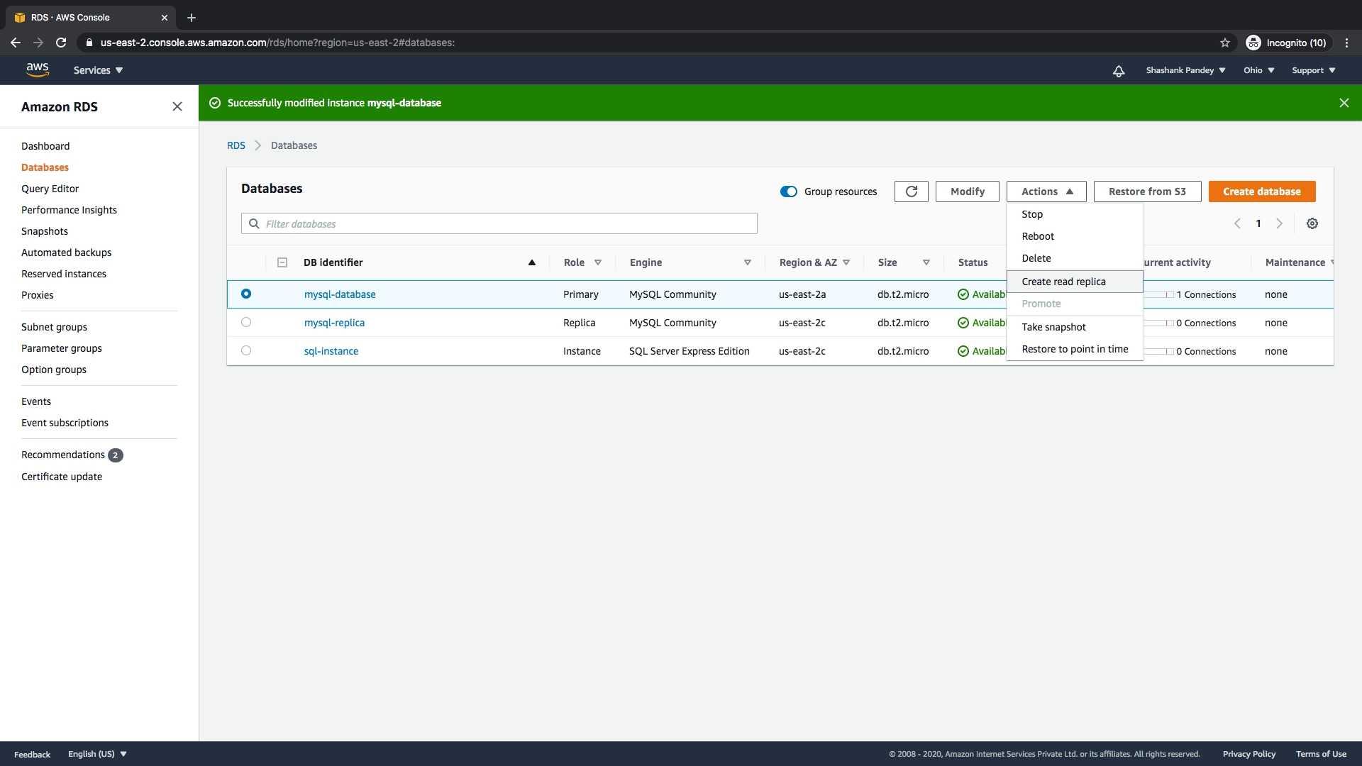 2. Use the main instance or create new Read replica for mysql instance Creating a new read replica instance.