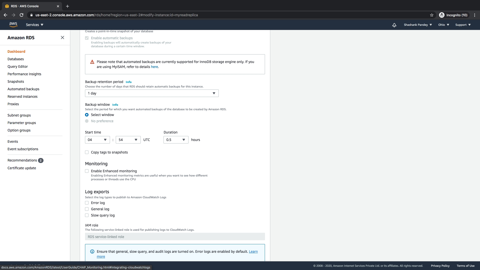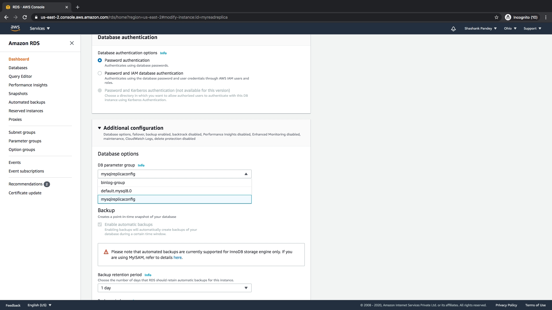 E. DB parameter group should be the newly created parameter group.