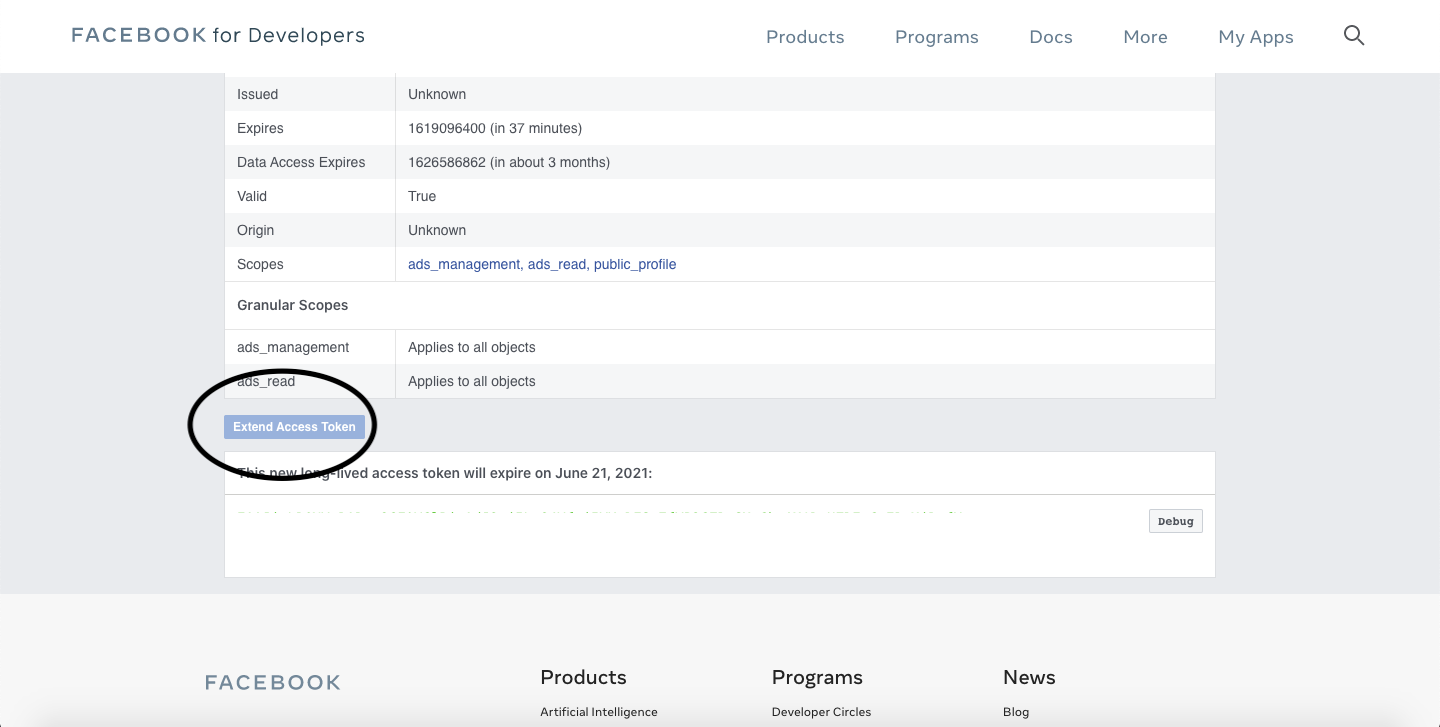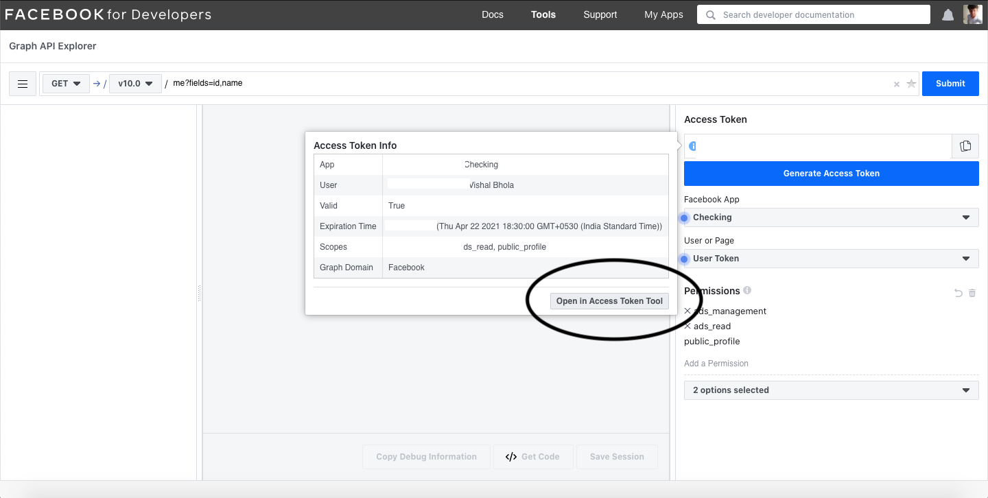 In your Facebook developer console, click on βToolsβ and βGraph API Explorerβ to generate Extended Access token. In the Permissions section give ads_read and ads_management permissions and click on Generate Access Token.