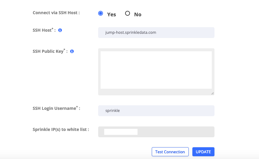 Whitelist Sprinkle IPs (34.93.254.126, 34.93.106.136) in your SSH Host. SSH host should be able to accept traffic from these Sprinkle IPs.