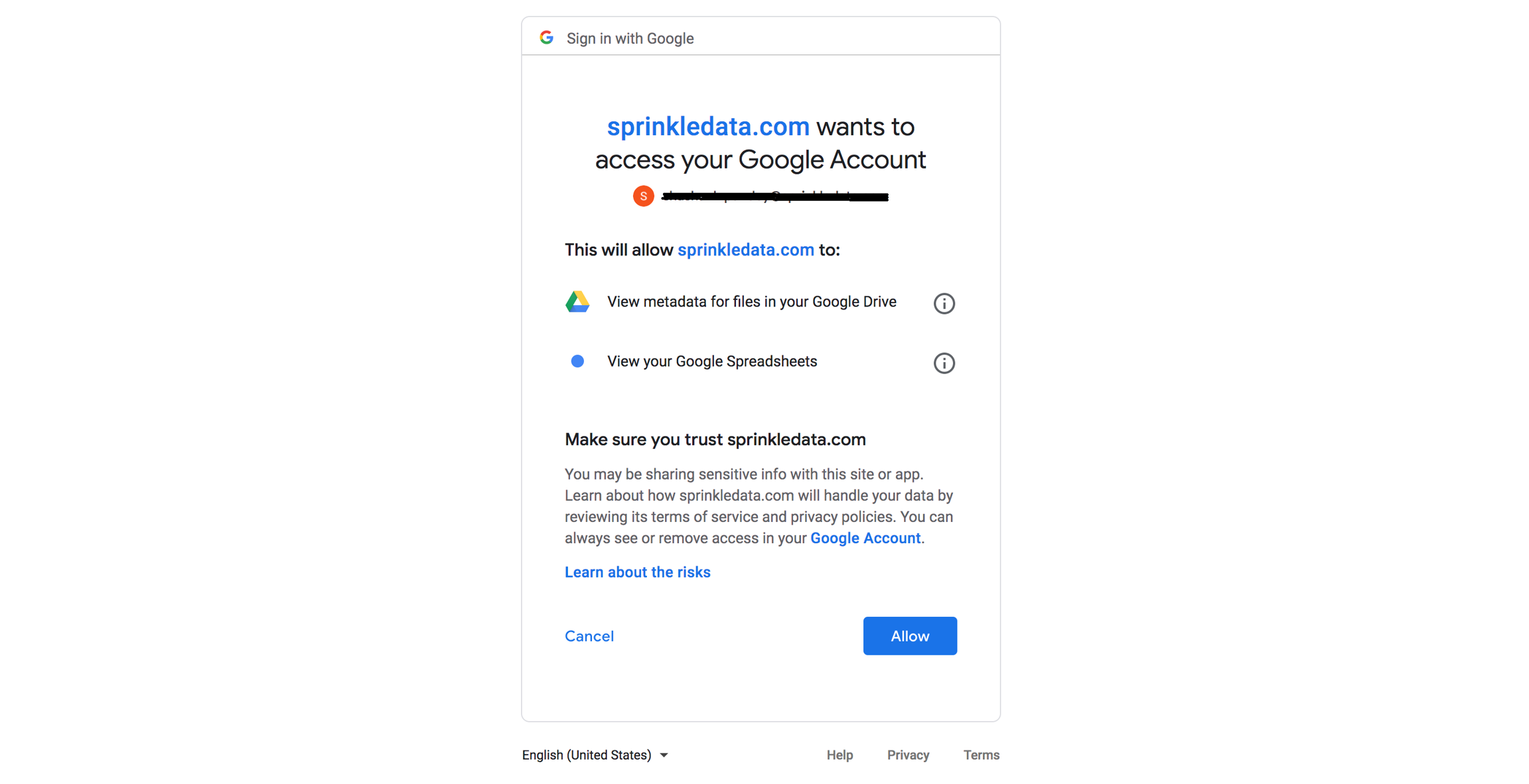 Post login, you will be prompted to allow permissions required for sprinkle to read data further. Once you provide consent by clicking on βAllowβ, the connection can be created from Sprinkle.
